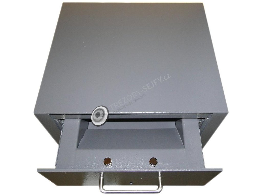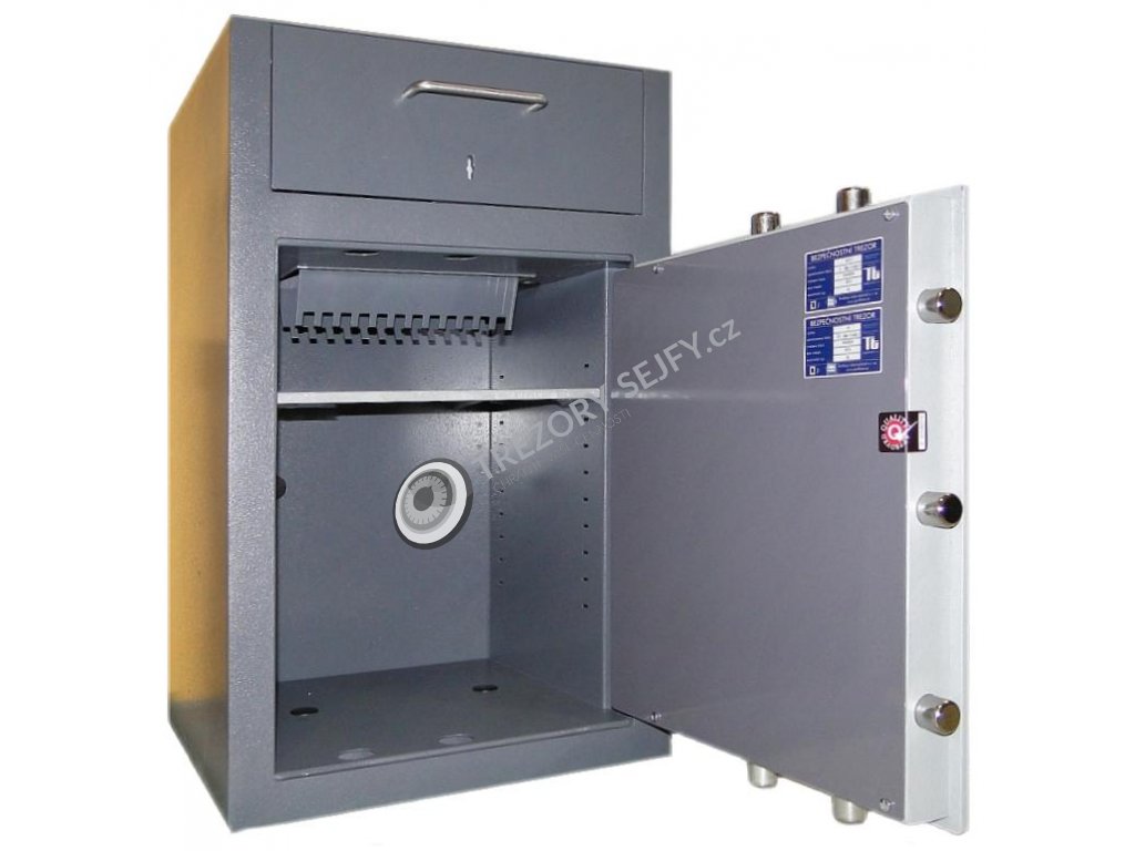 Toto není jen trezor s otvorem pro vhazování tržeb. Jedná se o plně certifikovaný (jak samotný trezor, tak i vhazovací část) trezor uznávaný pojišťovnami. Přední část dveří tohoto trezoru je vyrobena z 8 mm oceli. Mechanismus zámků a uzamykací závory jsou chráněny proti odvrtání pancéřovou deskou z kalené oceli. Zajišťovací mechanismus u těchto trezorů je třístranný, pohyblivé závory ve velkém množství jsou o průměru 25mm. Vhazovací mechanismus umožňuje prostup obálek formátu A5 a síle min. 40mm .Dodat můžeme ve větším rozměru a s jakoukoliv zámkovou variantou. Na prvním foto s příplatkovou - kovovou klávesnicí a kovovým madlem. (+1000 Kč bez Dph). V základním provedení s plastovou klávesnicí (poslední foto)